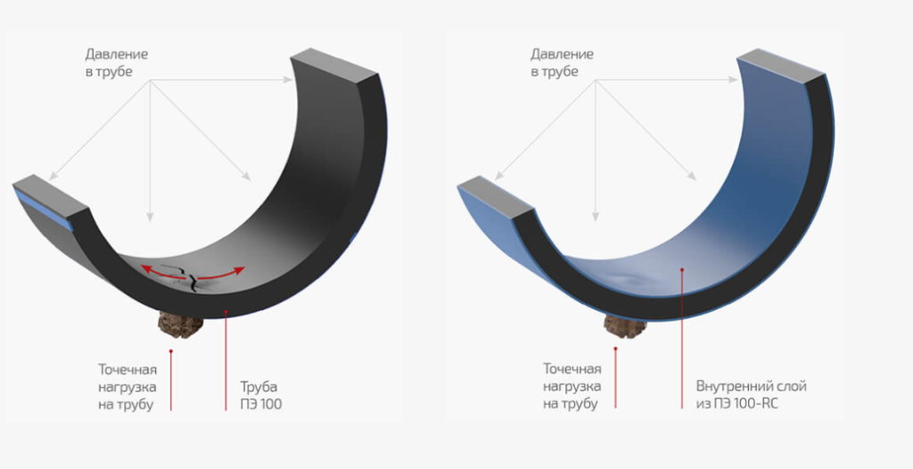 Изготовление внутреннего слоя трубы из стойкого к растрескиванию ПЭ 100-RC предотвращает появление трещин.